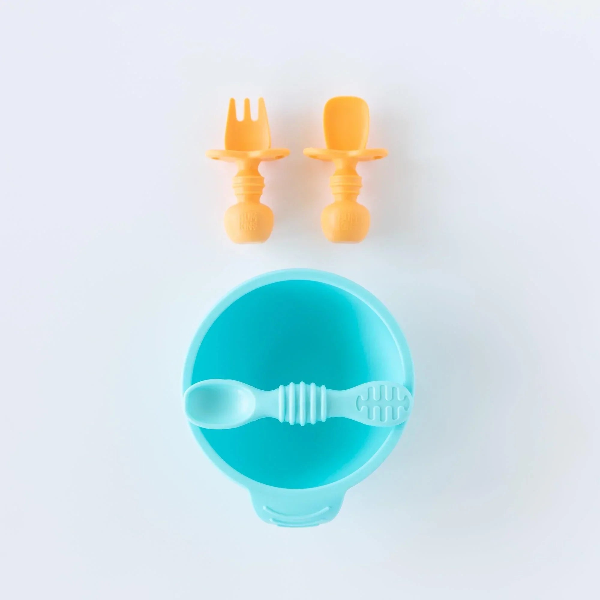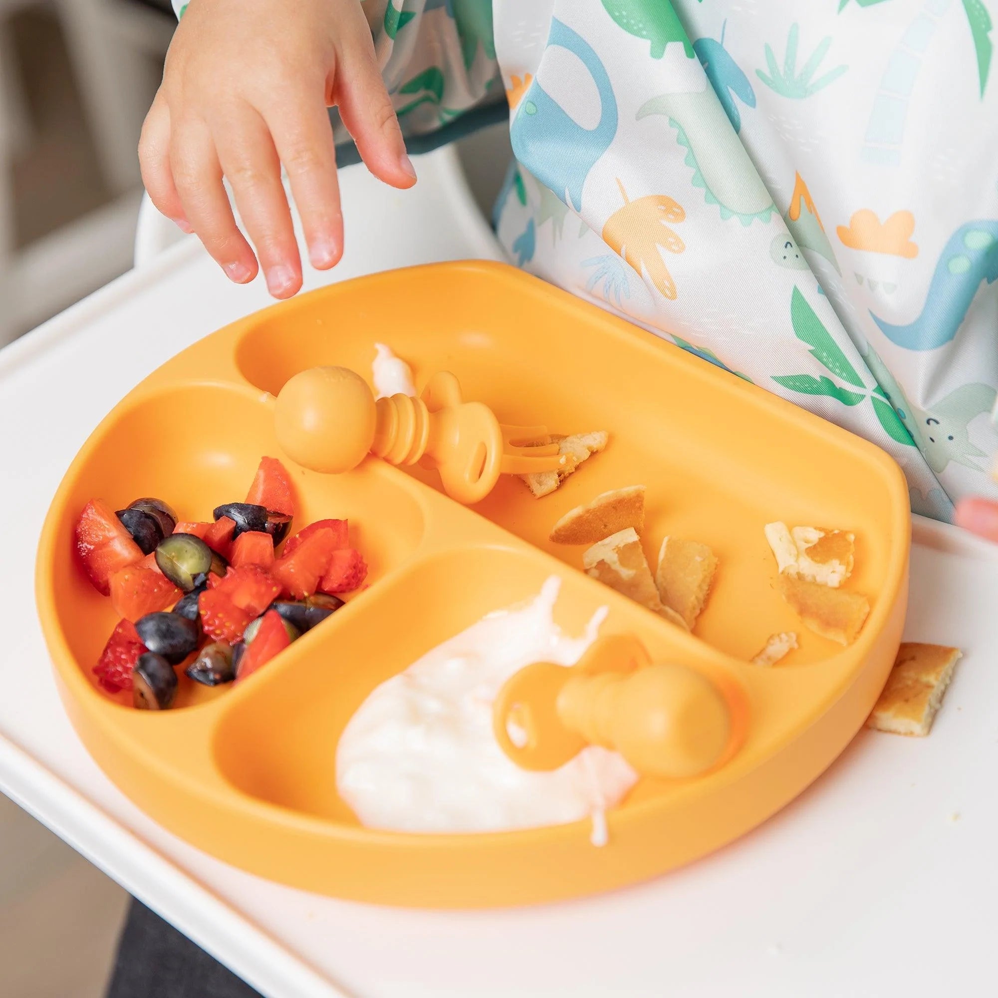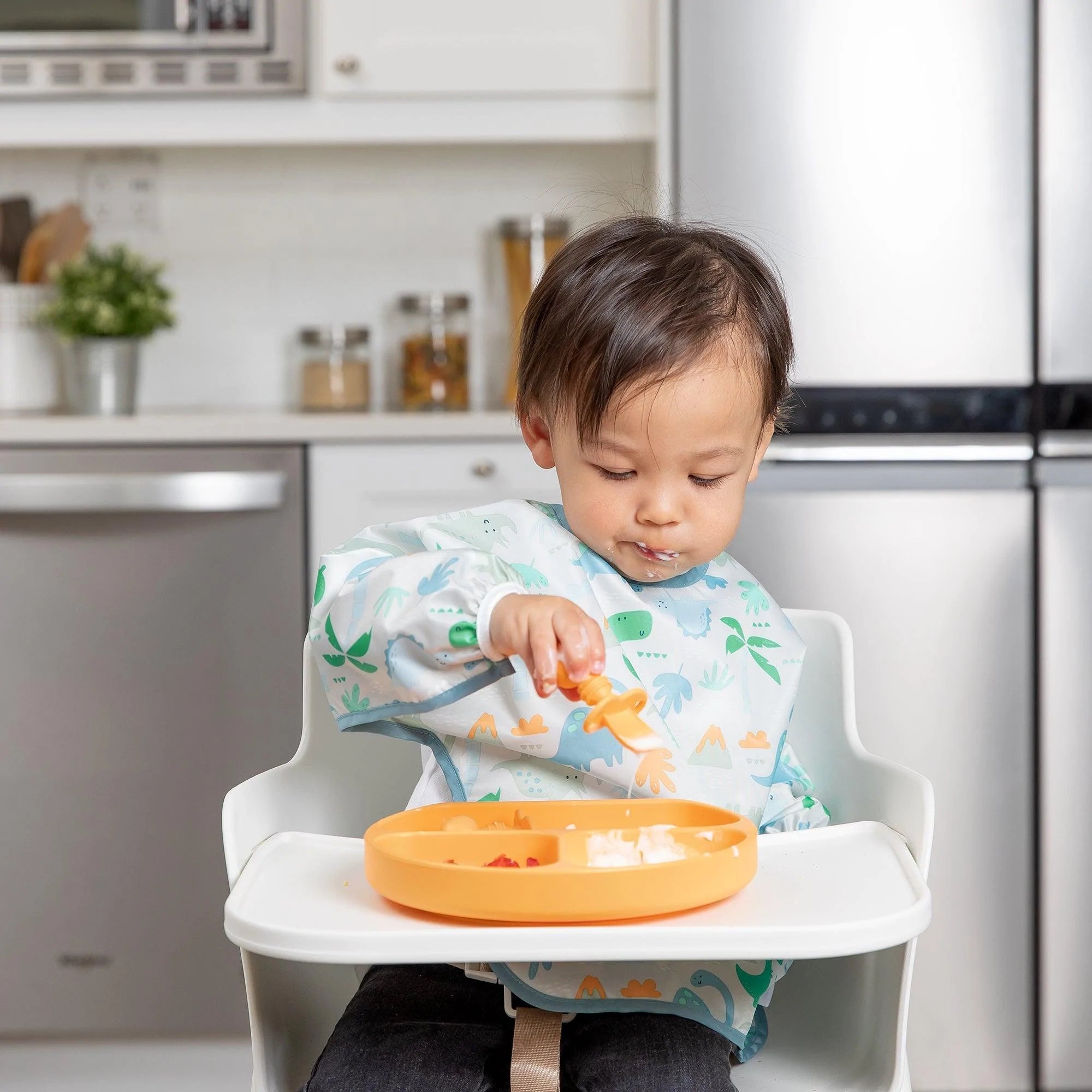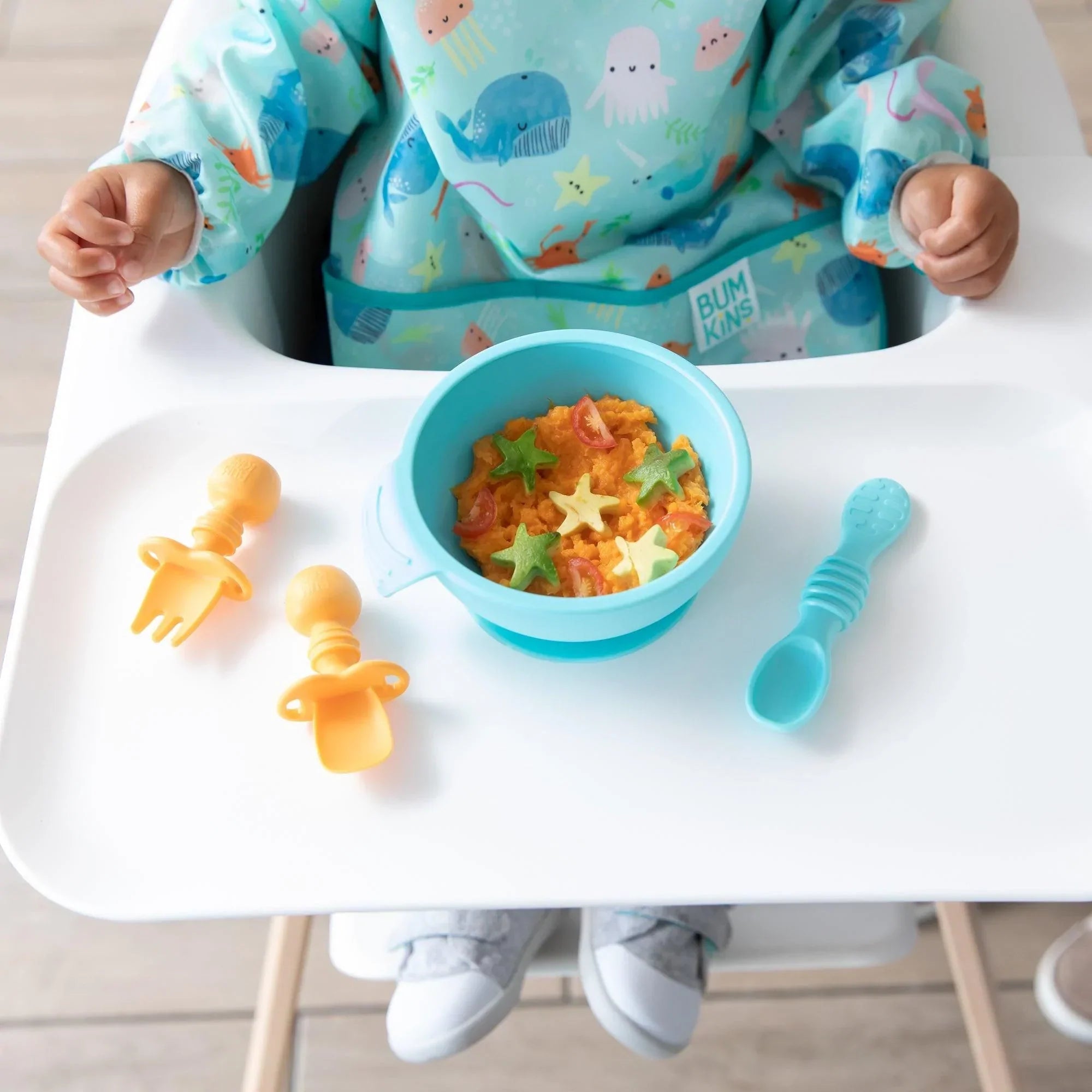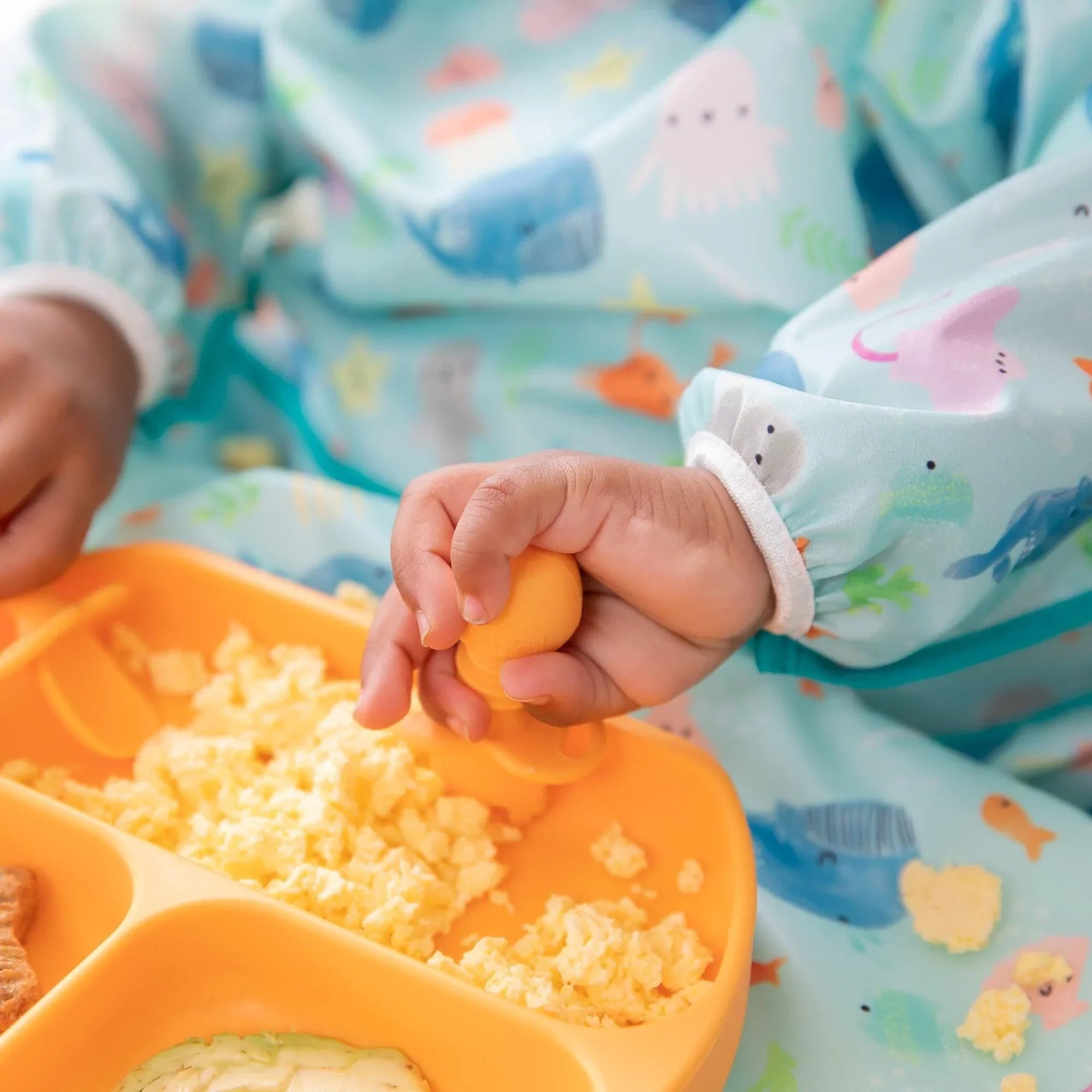 Mealtime is sunny with Chewtensils in Tangerine! We designed Chewtensils for Stage 1 of baby-led weaning – introducing babies to the concept of holding a utensil and feeding themselves. Both the spoon and fork are made from soft, textured, 100% food-safe platinum silicone that’s easy to grip and gentle on tender gums, with bendable heads for safety. The back of the spoon head has sensory bumps to stimulate gums. They’re perfect for dipping into puréed foods at the early part of baby-led weaning. Chewtensils are safe and can even be chewed on by younger babies before they’re ready to transition to silverware.